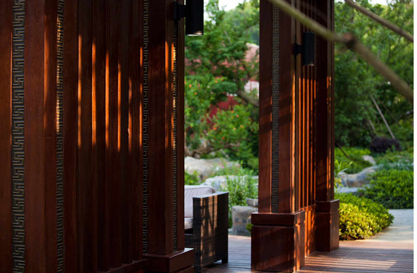 見禮檀園,府院初開,西入口門頭前場空間有限,景觀上采用 欲揚先抑的手法,以大禮東方、神韻在心為意境,將景觀在門頭后進一步表現,空間組織人車分流,中軸步道以“檀” 字紋為核心,兩側以云入境,如焚檀香以籠煙,林蔭清淺,天色清雅,業主歸家自然心境平和。