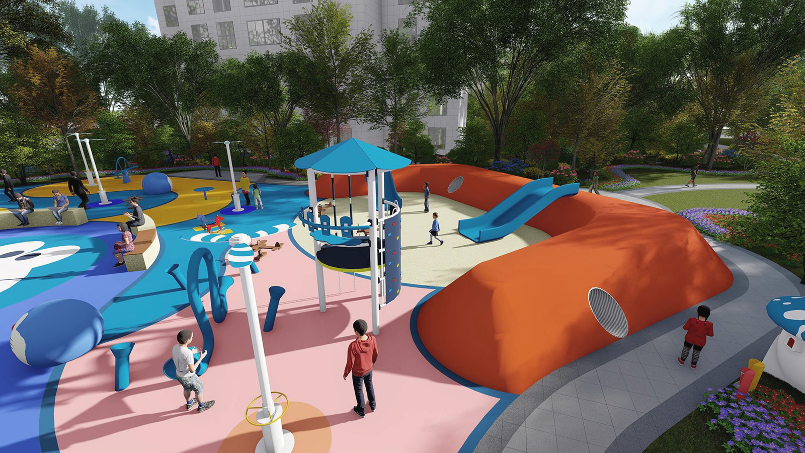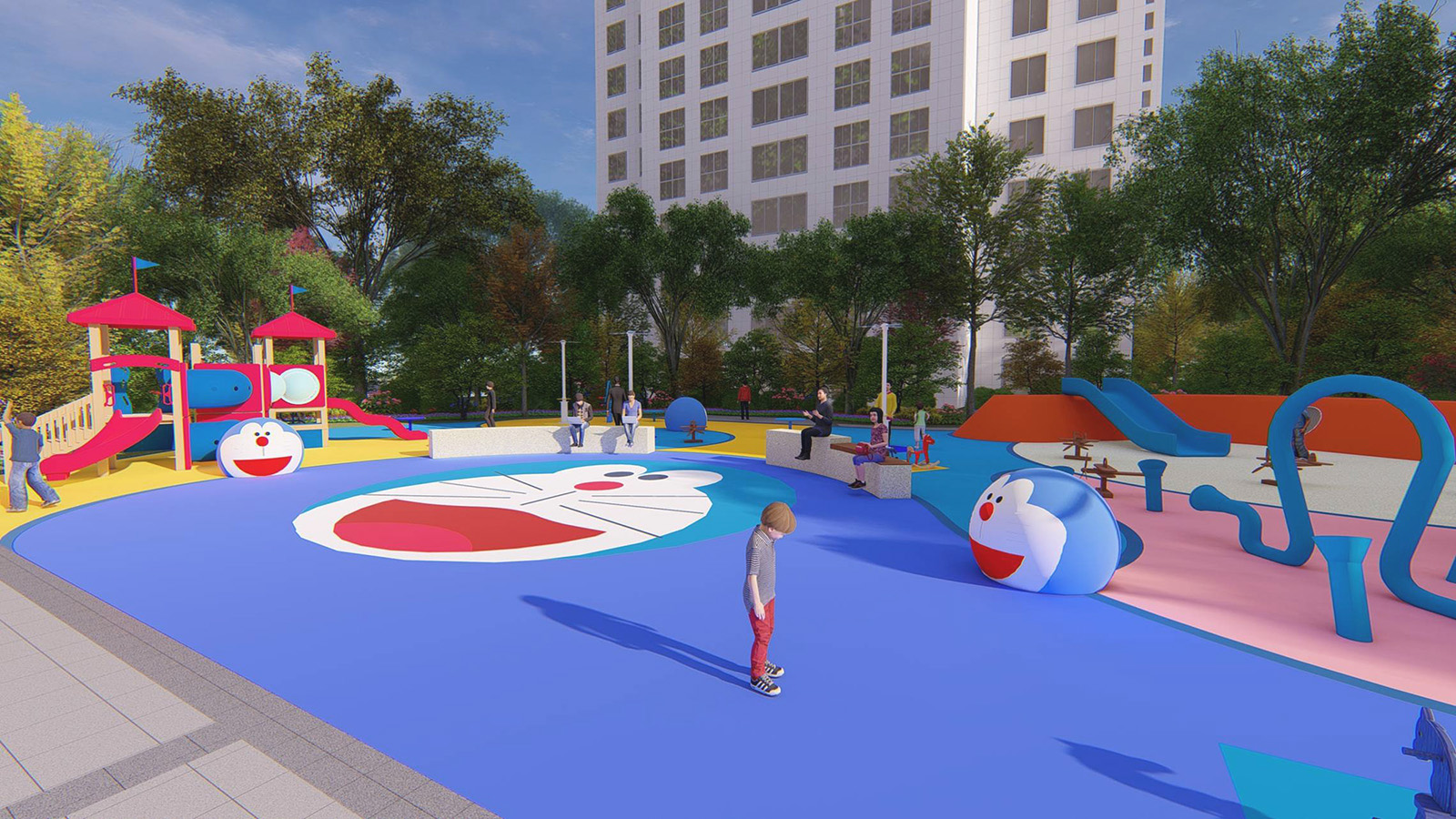 兒童活動(dòng)區(qū)以五感體驗(yàn)為設(shè)計(jì)理念,融入經(jīng)典卡通形象“哆啦A夢(mèng)” 為設(shè)計(jì)主題,通過(guò)新穎的互動(dòng)性設(shè)計(jì)充分調(diào)動(dòng)兒童的聽(tīng)覺(jué)、視覺(jué)、味覺(jué)、嗅覺(jué)、觸覺(jué)體驗(yàn),使兒童獲得獨(dú)特的感官體驗(yàn)的同時(shí),童夢(mèng)童享,啟發(fā)兒童想象力、創(chuàng)造力,并為整個(gè)家庭創(chuàng)造一個(gè)寓教于樂(lè)的優(yōu)美園林空間環(huán)境。