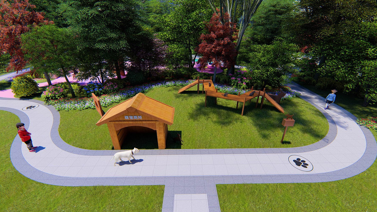 萌寵樂(lè)園組團(tuán)綠地內(nèi)布置萌寵步道、交友嬉戲場(chǎng)地,方便業(yè)主走出家門(mén),日常散步遛狗的生活需要,布置寵物廁所(沙坑)、和糞便清理袋取用裝置、洗手池等設(shè)施,便于主人在訓(xùn)練寵物后使用,保證周邊的衛(wèi)生安全,