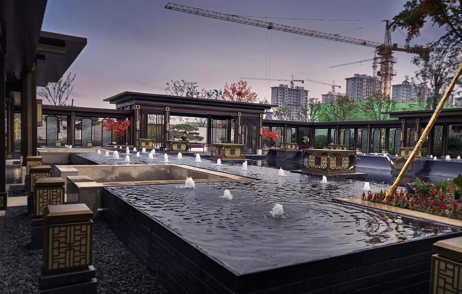 鏡面水景輕靈、優雅、致韻;雙排四座宮燈雕琢萬字符,寓意前程萬福。