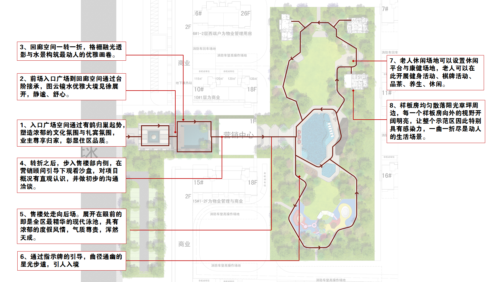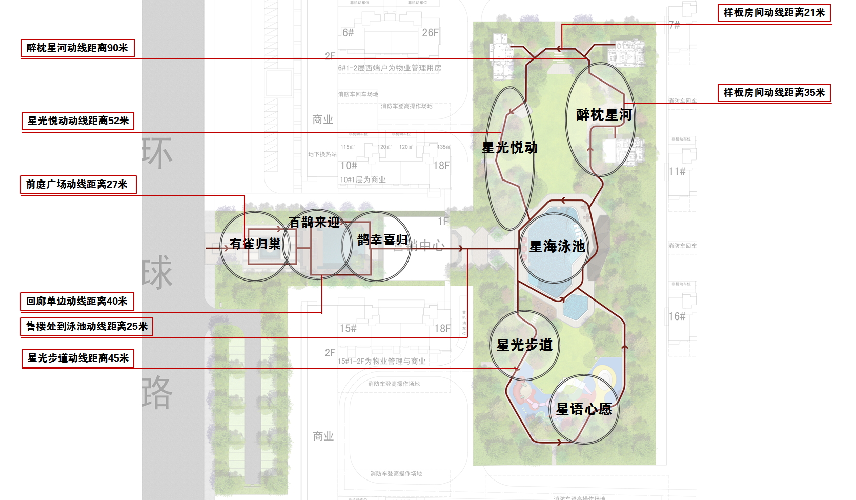 星光步道——曲徑通幽,兩側(cè)林蔭成趣,芳草鮮美,落英繽紛,自然引導客戶沿著精心設計的游線進入下一個雅趣空間。
