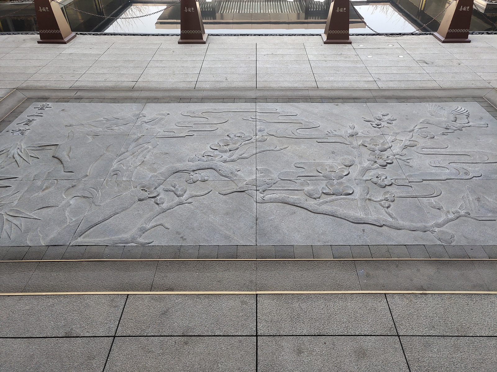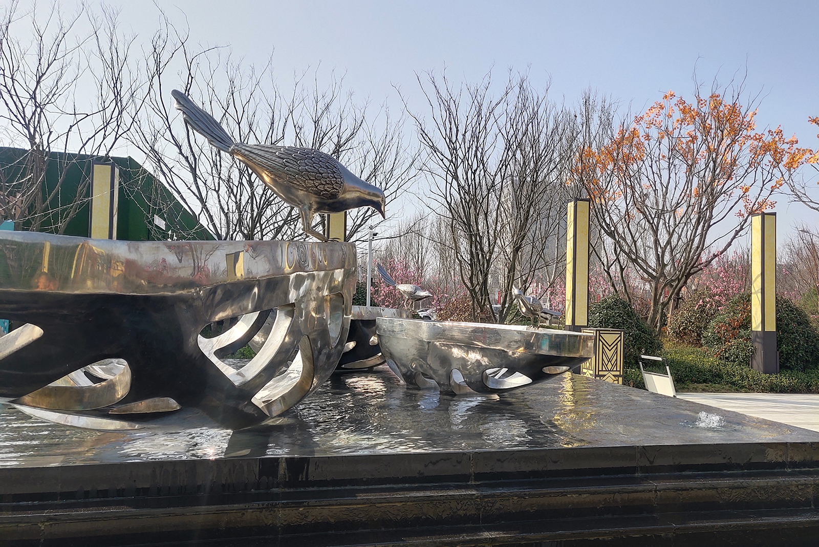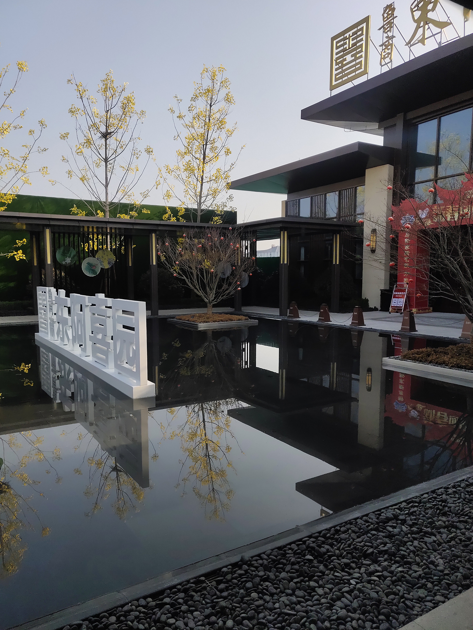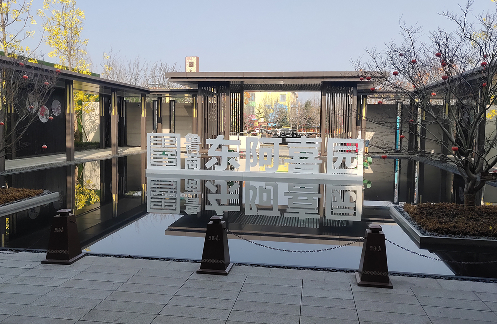 前場采用一禮(有鵲歸巢)、二迎(百鵲來迎)、三境(鵲廊鏡水)設計手法,入口禮儀廣場、景觀燈柱禮賓歸家,百鵲來迎景墻引導賓客進入場景,通過風雨連廊,見中軸線大尺度水景,藏風納氣。水景大氣通透,煙波浩渺,禮儀燈光步道,靜謐舒心,大氣、精致、從容。