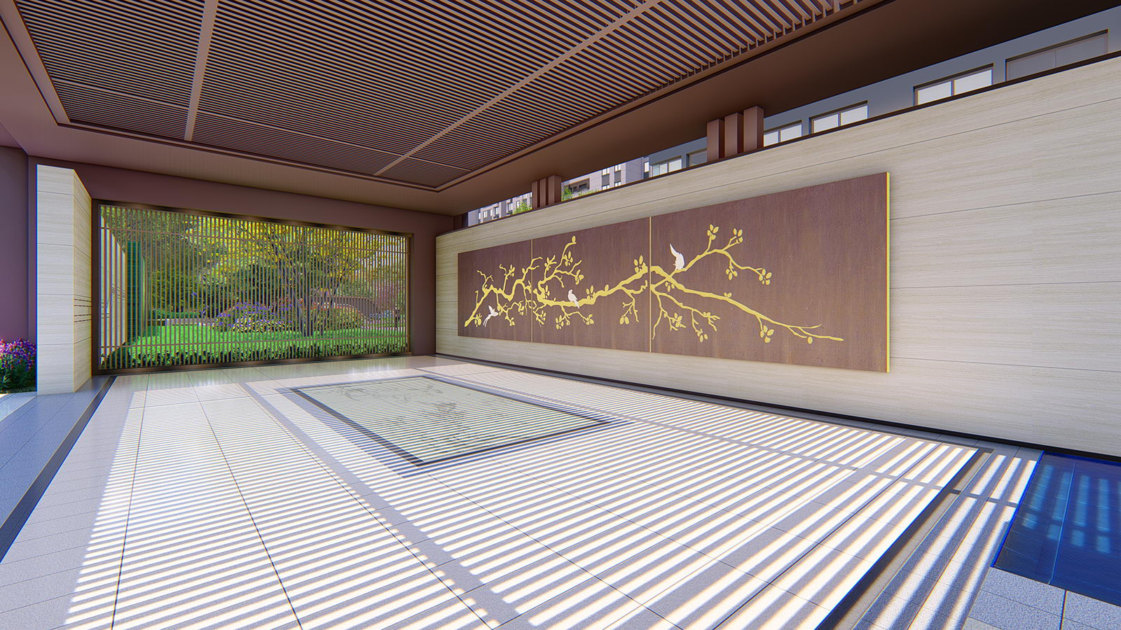 門頭對景處設置“喜上眉(梅)梢”景墻,客戶視線跟隨梅花枝條方向延伸,巧妙構建空間遞進關系,為項目增添趣味及內(nèi)涵。