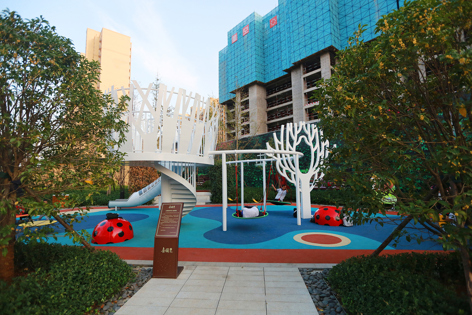 兒童樂園以親子同樂,喜鵲和鳴為意境,設置兒童體驗熱點,同時布置家長休閑看護區(qū)與洽談區(qū),園路旁的喬木夾道種植,豐富的綠化層次,都能增強客戶對項目品質(zhì)更加直觀的感受。