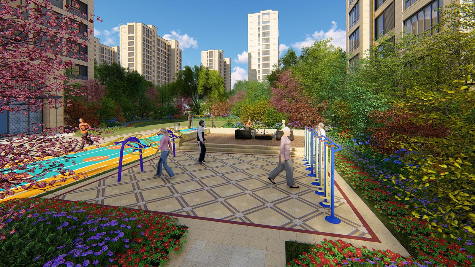 成人健身組團以成人健身為主體,兼具兒童娛樂功能,打造為一處老少皆宜的綜合性活動健身空間。