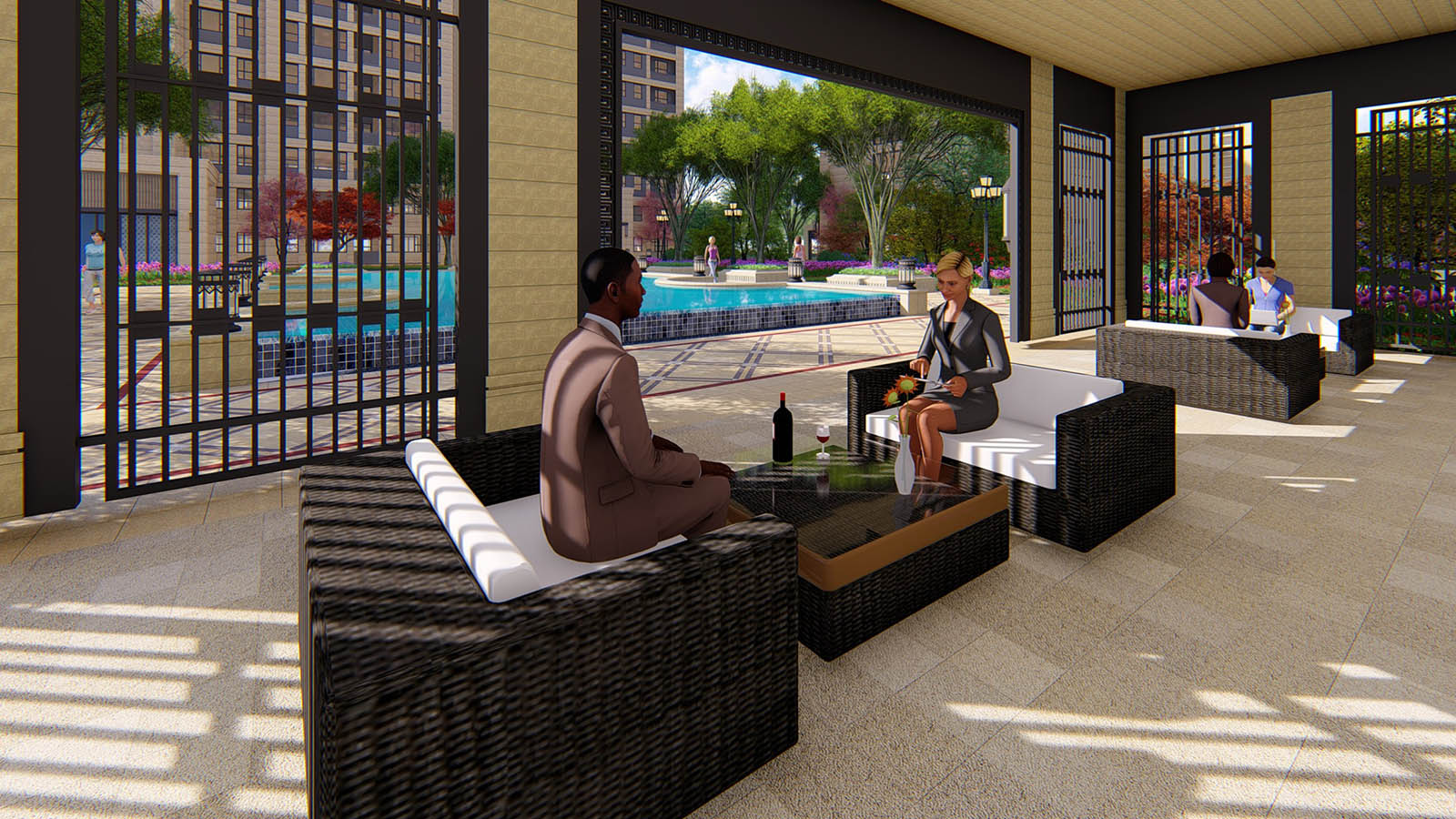 46#-48#樓宅間,為業主呈現最靜謐、舒心的精致鏡面水景,休閑廊架、木平臺與林蔭相伴,水面燈光優雅、浪漫,融光和影,曼妙唯美,讓業主更加貼近自然,功能上同時作為業主會客訪友的“景觀會客廳” ,為業主打造真正的心靈居所,靜謐優雅、詩意棲居生活。