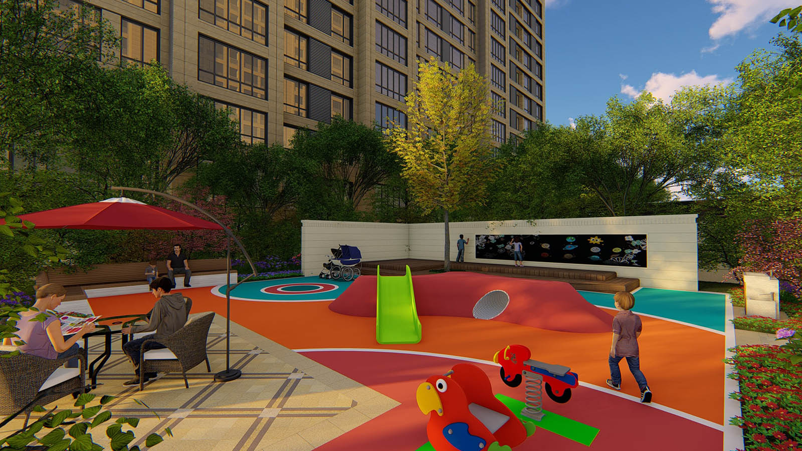 設計時深入研究各年齡段兒童的戶外活動方式與形態,營造出適合2-12歲全齡兒童的人性化活動場地,兼顧家長的看護與親子互動需求,在兒童活動區旁設置成人休息區,寬面座椅得以讓孩子和家長得以盡情放松休息,座椅倒角設計降低安全隱患,同時座椅高低組合排布兼具母嬰臺功能,座椅旁預留杯皿放置區,并設有室外洗手池,兒童車停放位,科學系統的利用空間。