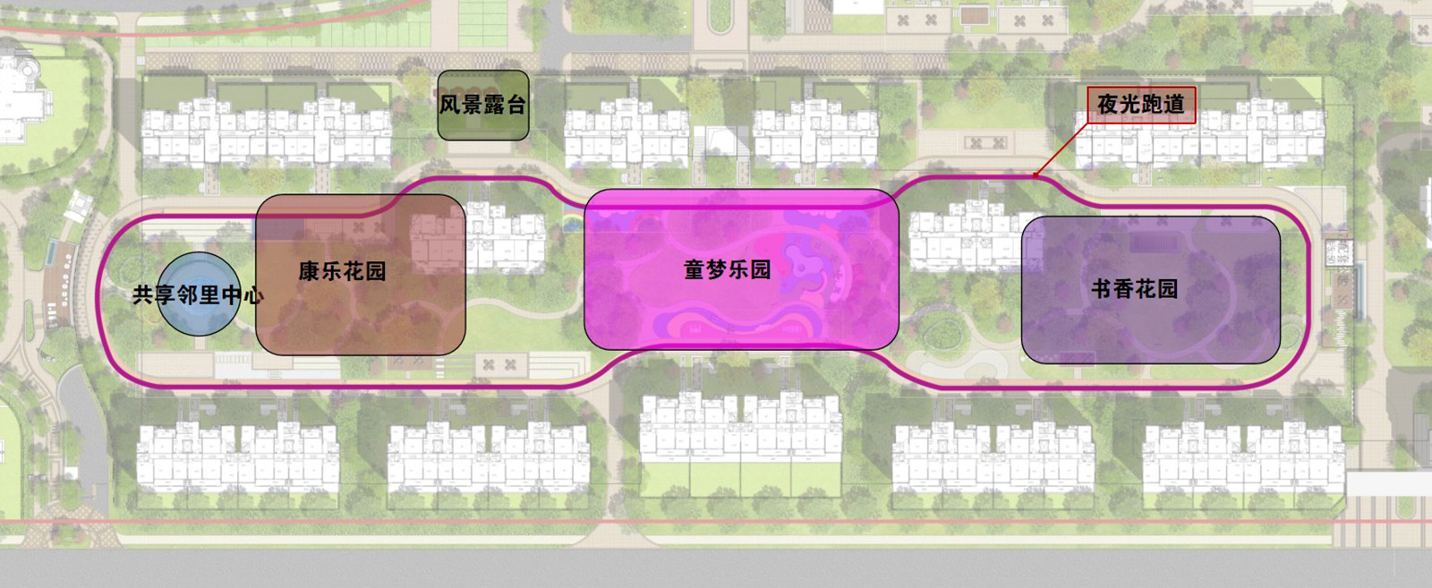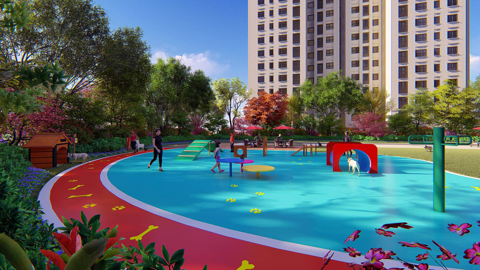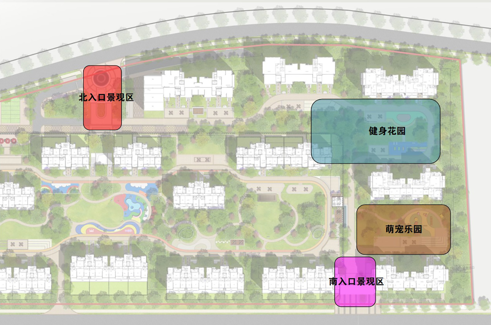 高層區(qū)以高端人才為目標(biāo)群體,宅間組團設(shè)置以萌寵樂園、健身花園為主空間,配套設(shè)計多個宅前休閑空間的景觀功能區(qū),契合業(yè)主群體生活起居習(xí)性。