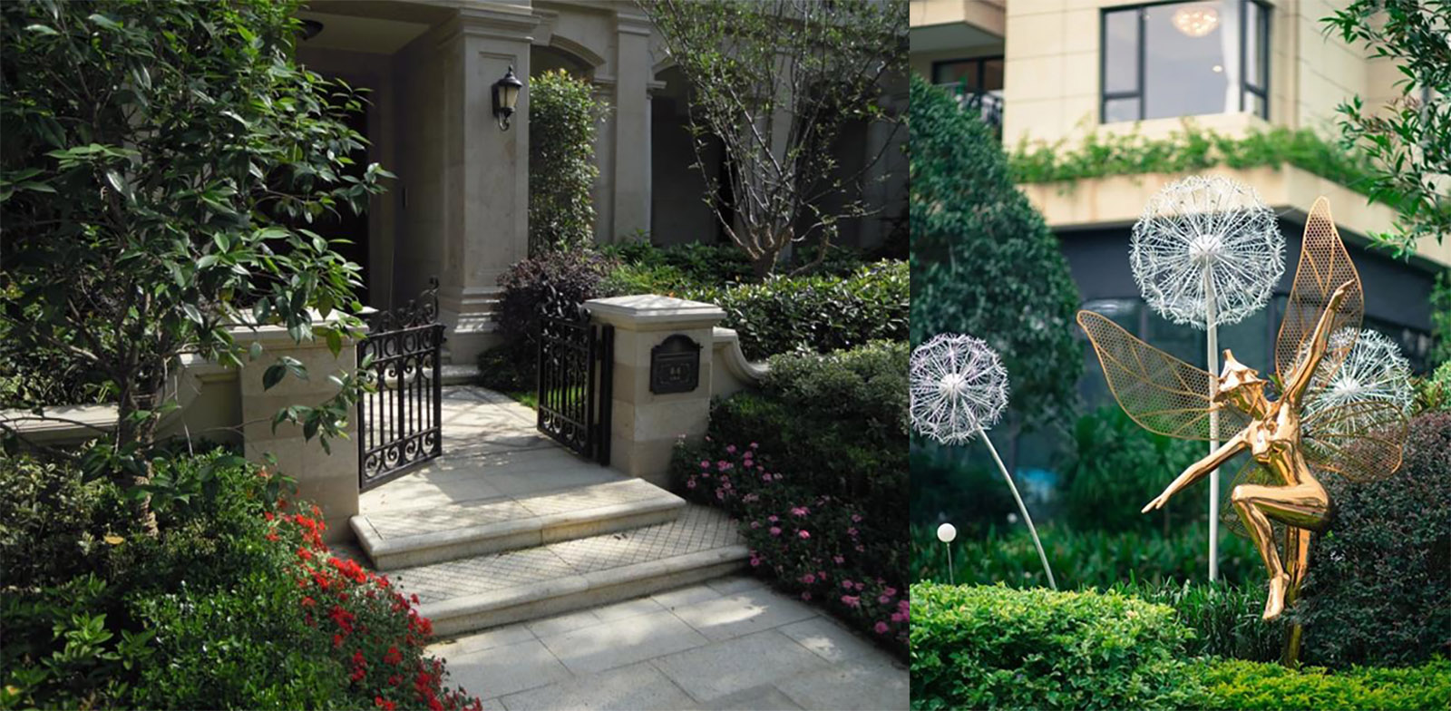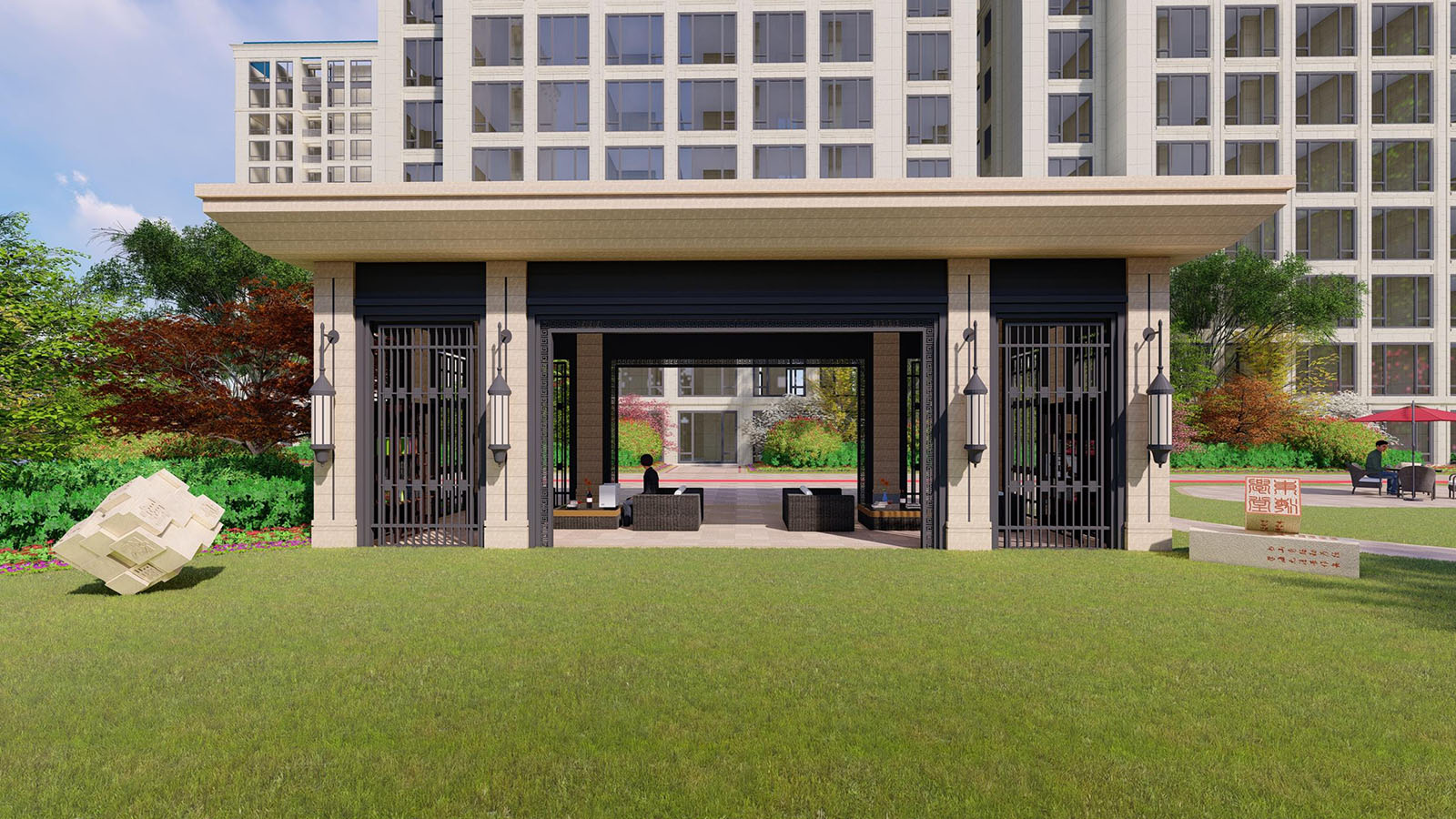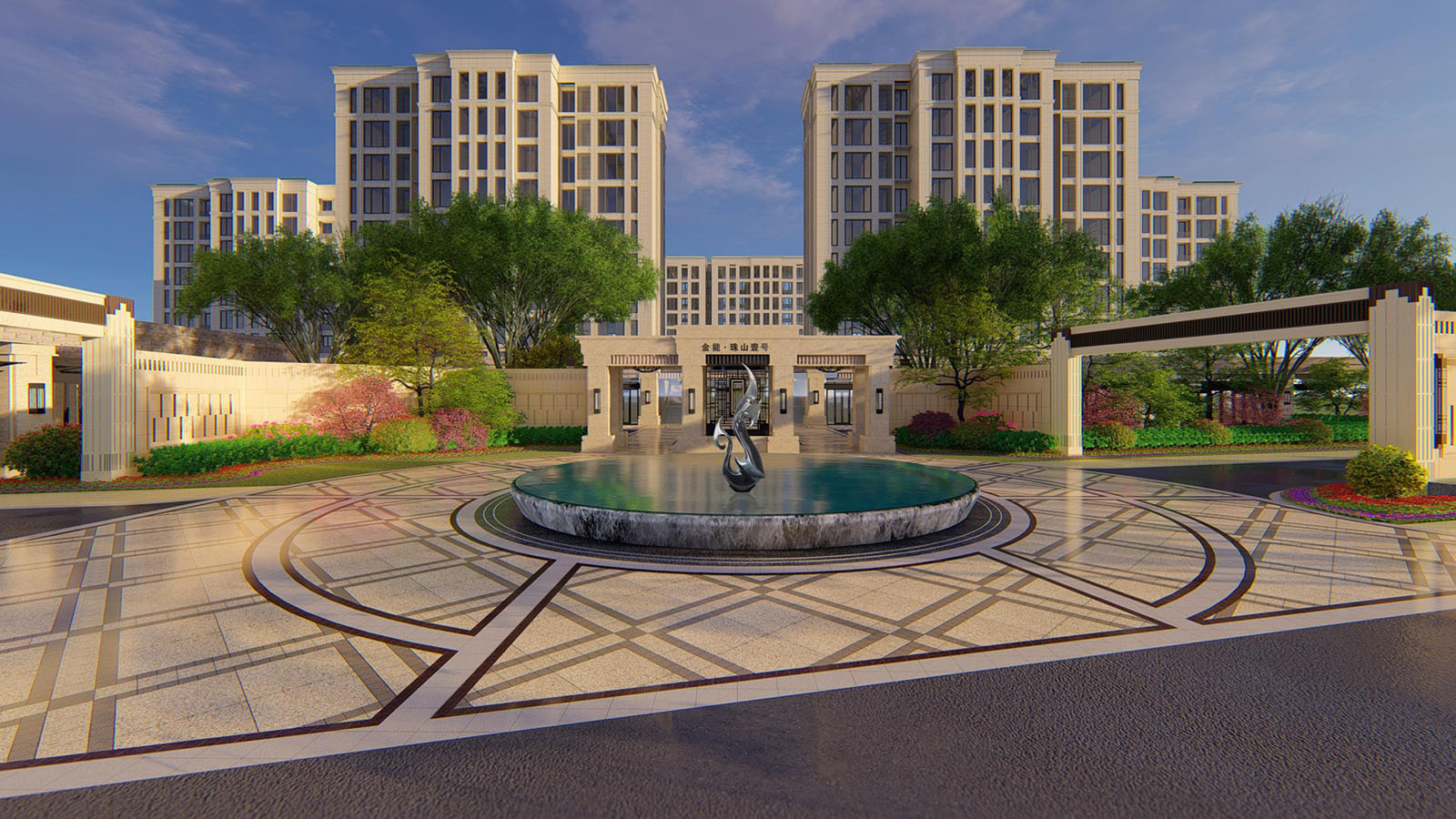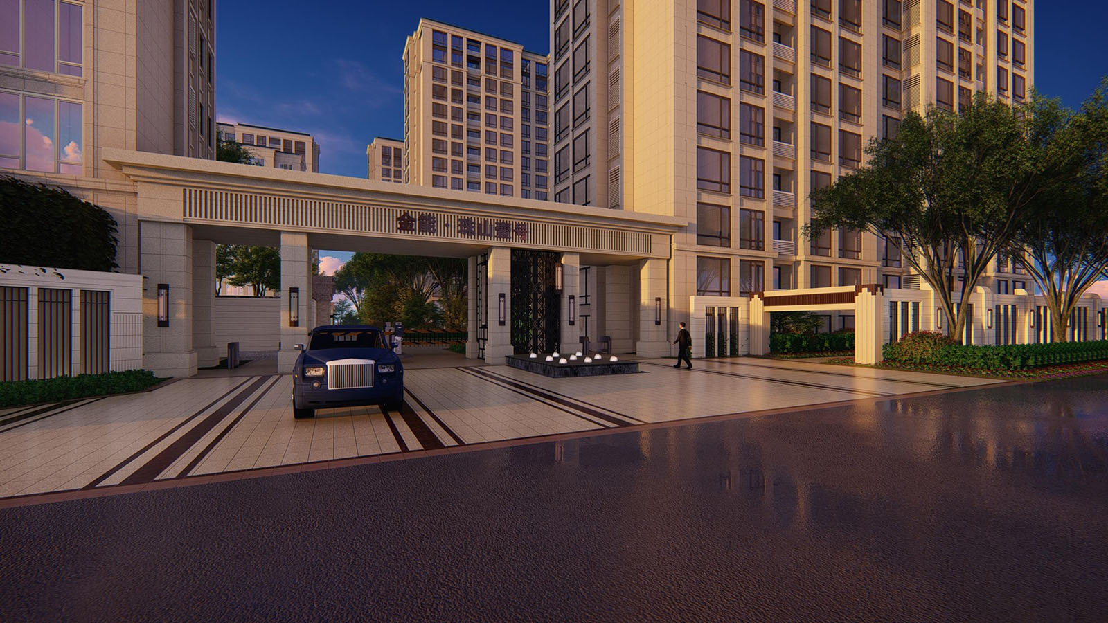 入口廣場的鋪裝線條、立面形象等風(fēng)格延續(xù)建筑與景觀新古典的時尚與韻味,尊貴與雅致,石庫門與景墻結(jié)合設(shè)計,形成統(tǒng)一整體、雍容大氣的禮儀迎賓效果。