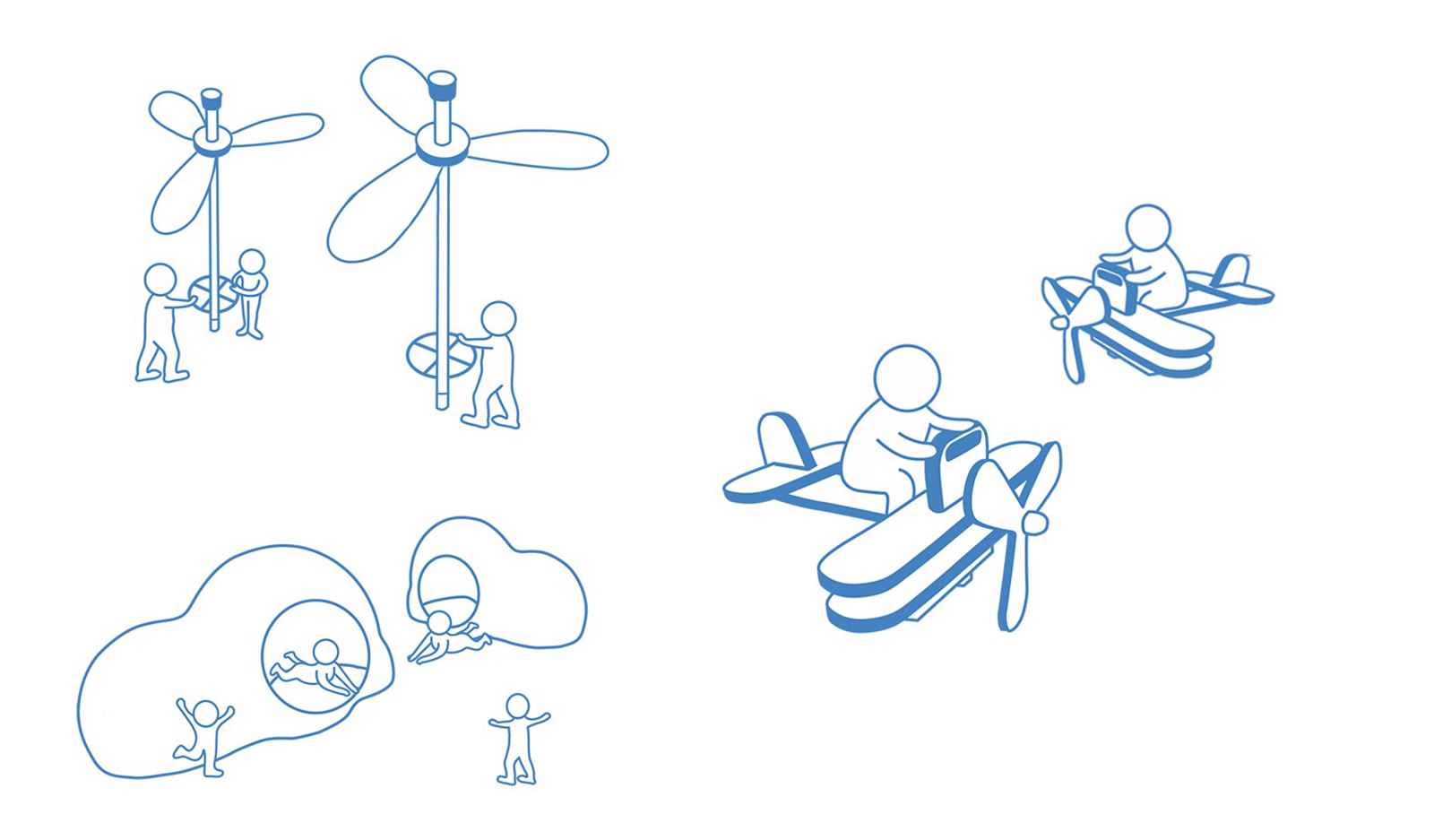 親子互動風(fēng)車、夢幻飛行搖搖馬、云屋鉆洞概念圖