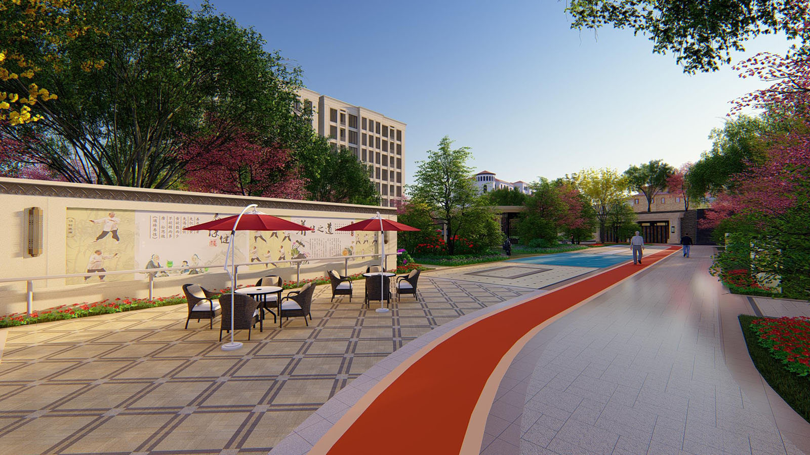 康樂花園包含太極健身區(qū)、棋牌娛樂區(qū)、康樂健身區(qū)、靜養(yǎng)休閑區(qū)、卵石康健步道五大功能,太極健身區(qū)設(shè)計太極點位,方便老人展開太極運動,通過對于黃山區(qū)當(dāng)?shù)厣盍?xí)慣的深度調(diào)研,特別設(shè)計了棋牌娛樂空間,方便鄰里間在茶語飯后休閑時間,切磋棋牌游戲,特別強調(diào)林下空間,林蔭步道自然蜿蜒,曲徑通幽,將新古典風(fēng)格下自然悅居,怡心養(yǎng)性描繪到極致,為老人創(chuàng)造安靜祥和的康樂空間。