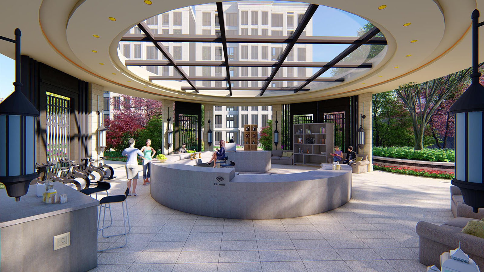 有溫度的社區(qū),尤其注重景觀的實用性,在地塊最中心的區(qū)域,設(shè)計提煉共享鄰里中心的概念,讓景觀不單單只是一個簡單的構(gòu)架,而是為居者日用的生活場所,萬物箱,共享書柜、母嬰臺,舒適的休閑沙發(fā)卡座、無線WiFi熱點,USB安全充電插口,業(yè)主可以在此會客、賞景、休閑、閱讀,同時具有戶外廚房的功能,布置的燒烤臺、烤箱,業(yè)主也可以在此燒烤、烘焙,陽光草坪溫潤舒適,讓居者與自然一體,靜享生活與美食,甚至在其中布置共享健身器械,即使在雨天也能享受健身鍛煉的樂趣。