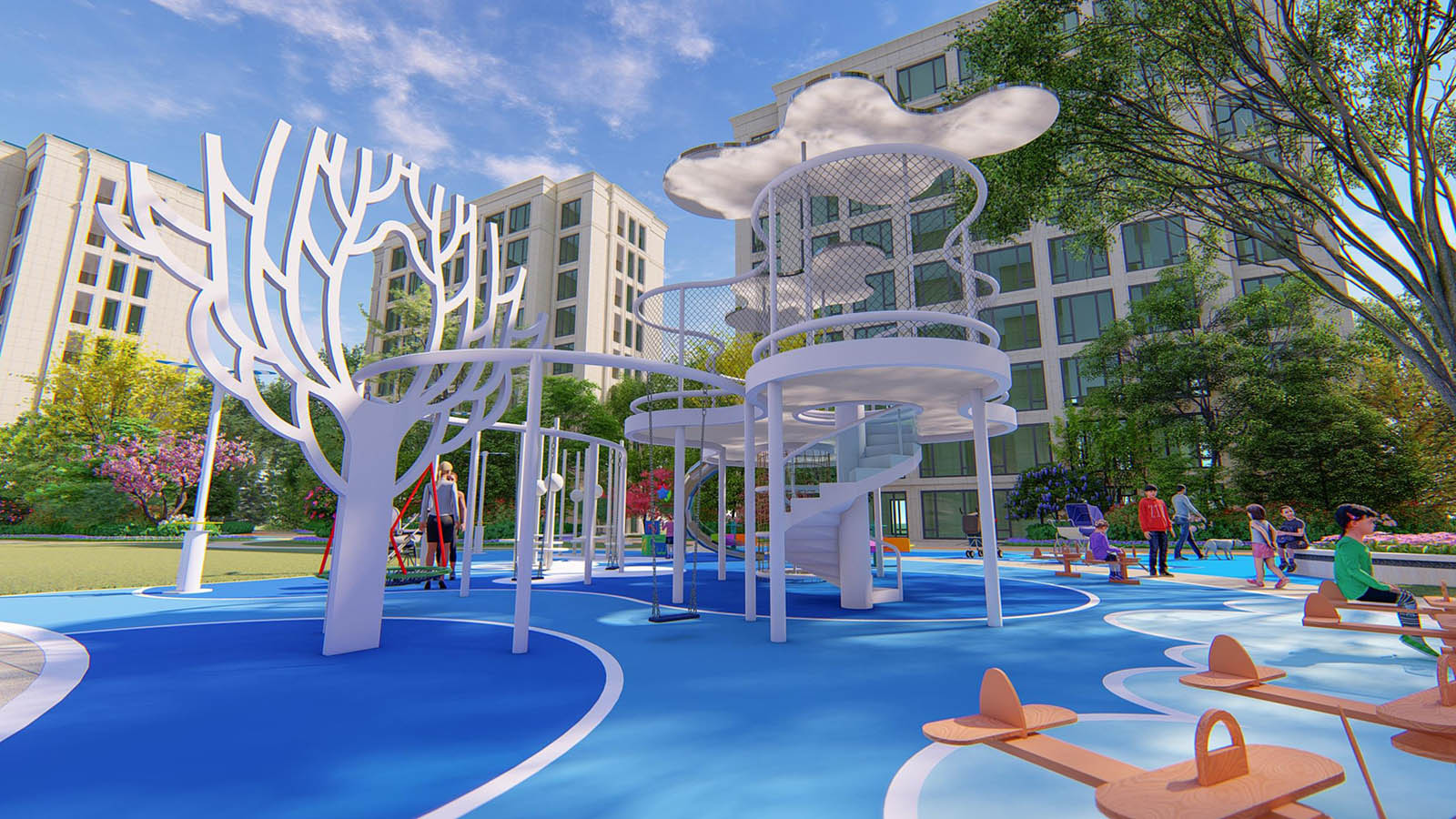 童夢樂園以“云鏡幻夢” 為設(shè)計主題,特別設(shè)計的云鏡主題滑梯為主景,讓兒童感受云與天空的幻夢鏡光倒影,配置夢幻風(fēng)車、互動風(fēng)車、飛行搖搖馬,如夢似幻,以幸福棲居、親子同樂為核心內(nèi)涵,創(chuàng)造家長與兒童互動娛樂活動為主題的親子空間,深入研究兒童的戶外活動方式與形態(tài),創(chuàng)造兒童友好社區(qū),兼顧長輩的看護需求,通過新穎的互動性設(shè)計,調(diào)動兒童參與積極性,著力打造一個樂園級別的戶外兒童樂園。