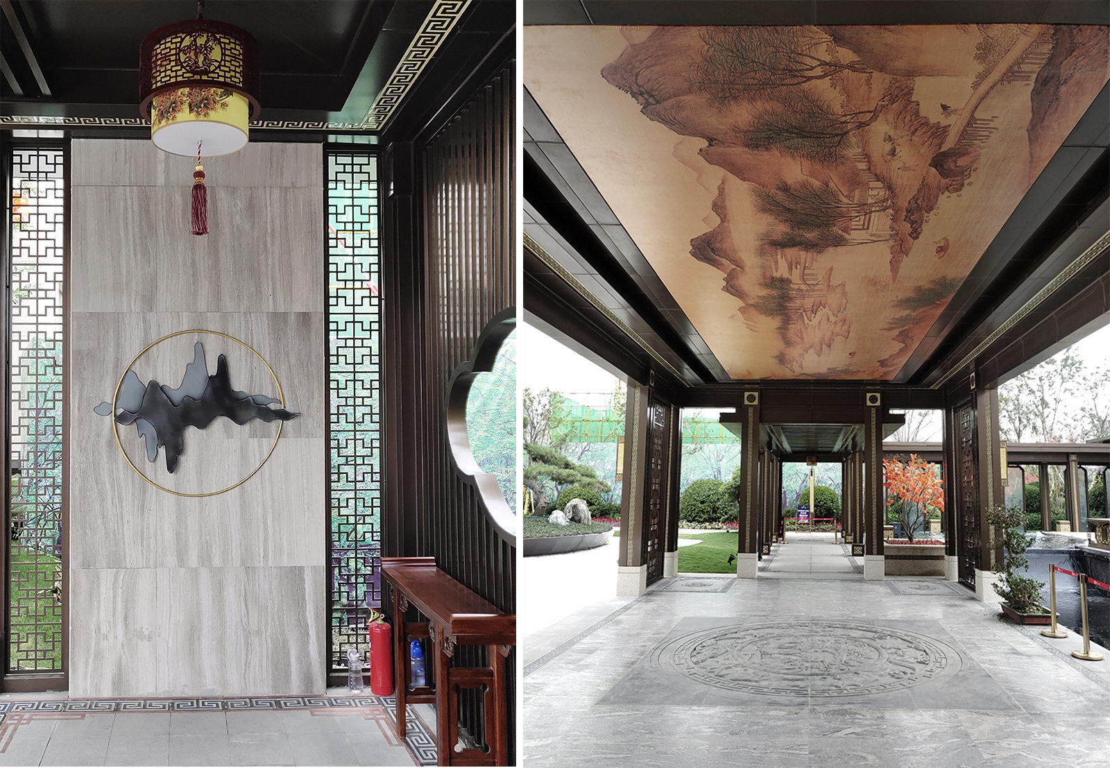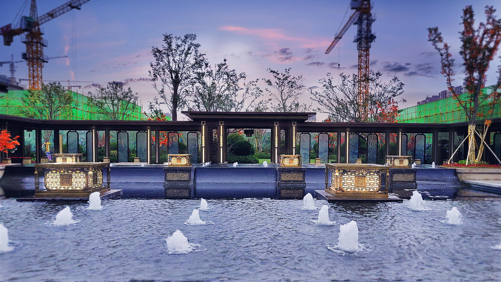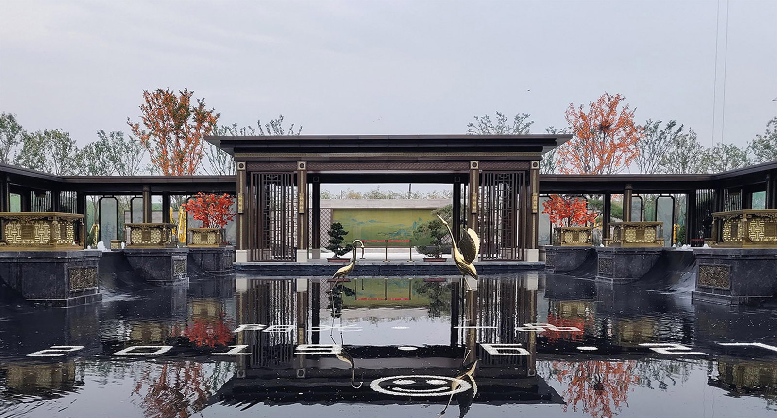鏡面水景輕靈、優(yōu)雅、致韻;雙排四座宮燈雕琢萬字符,寓意前程萬福。