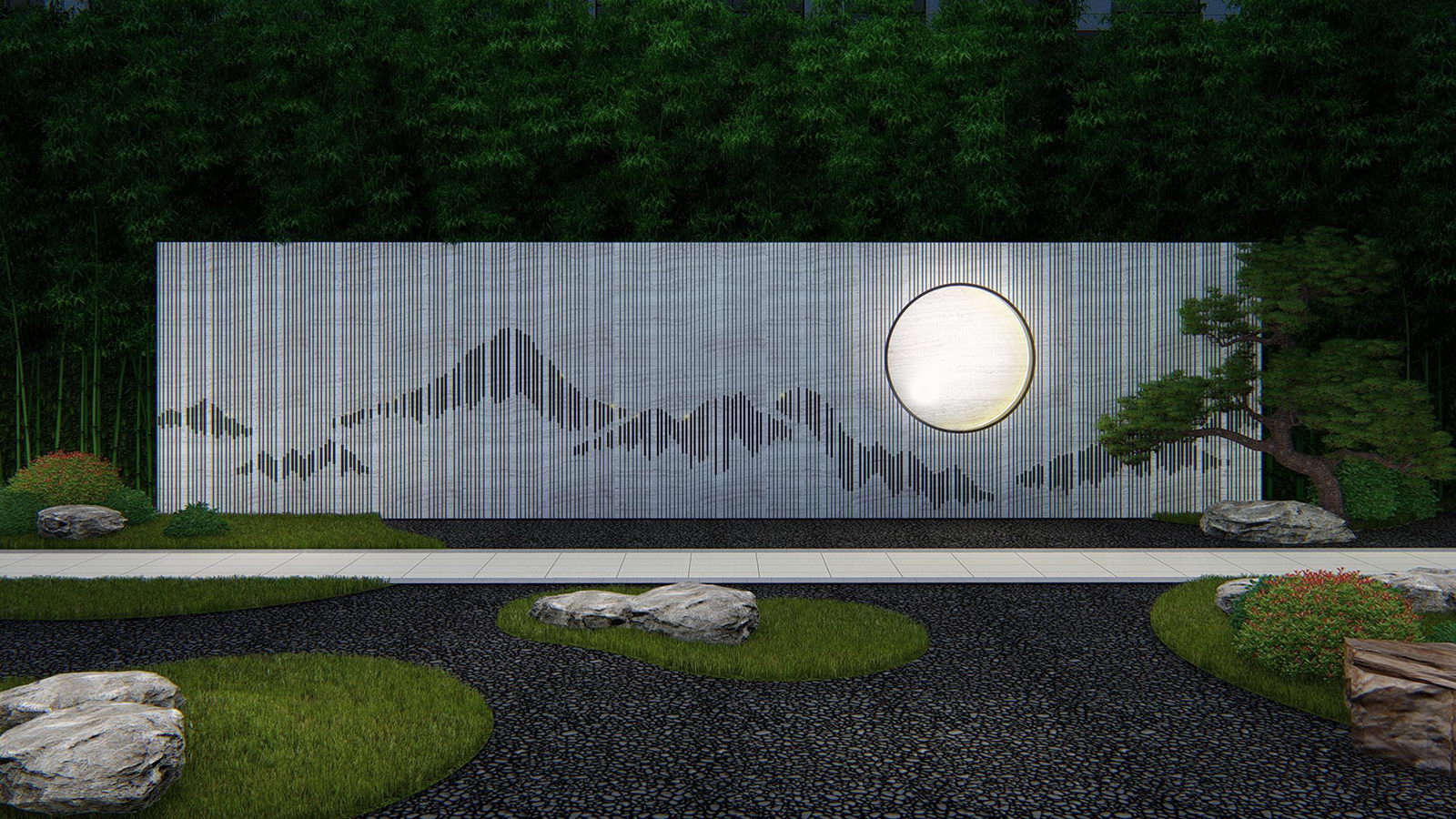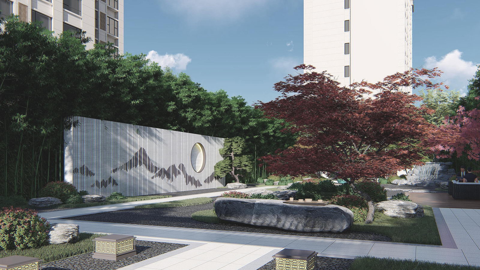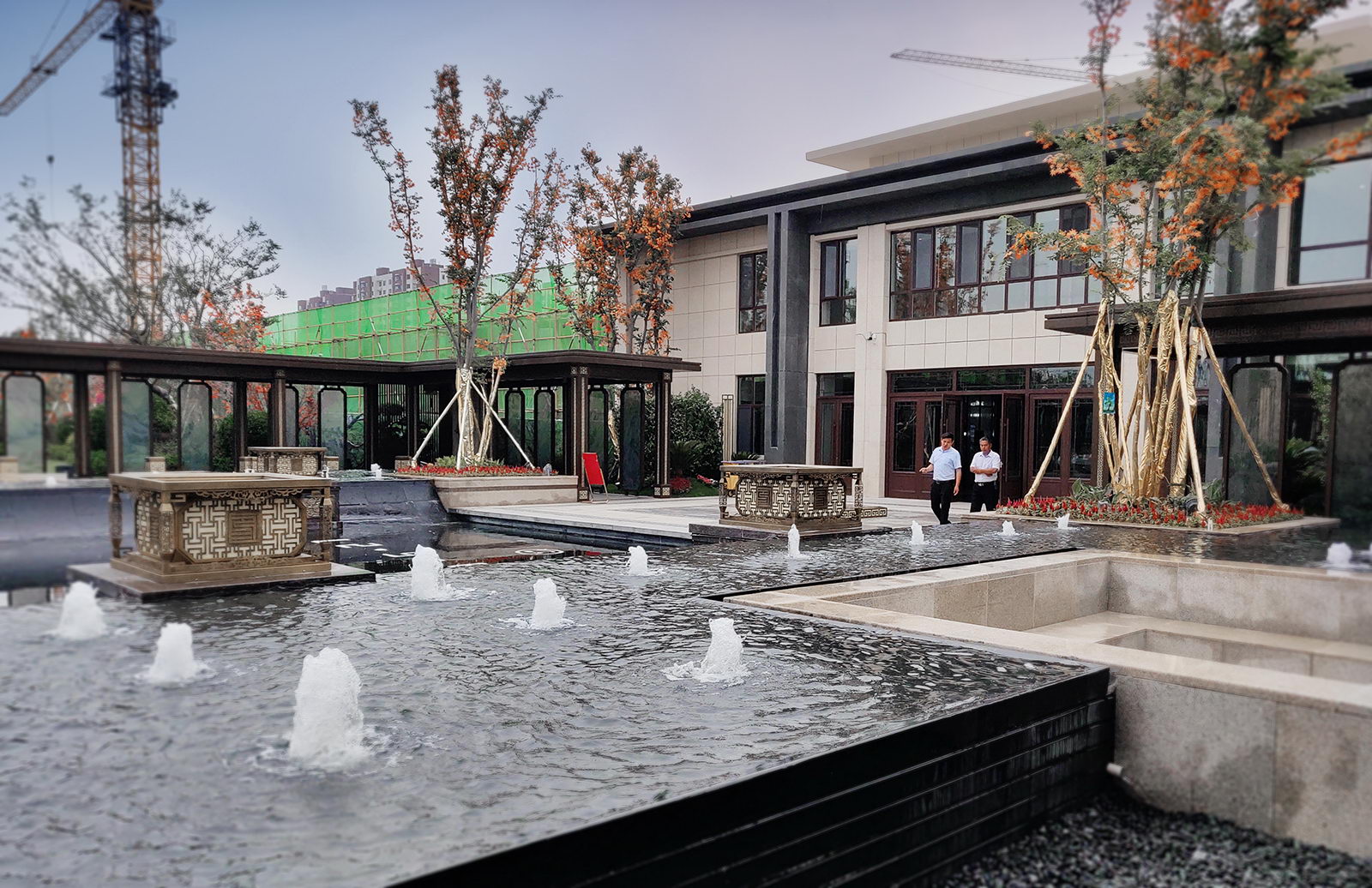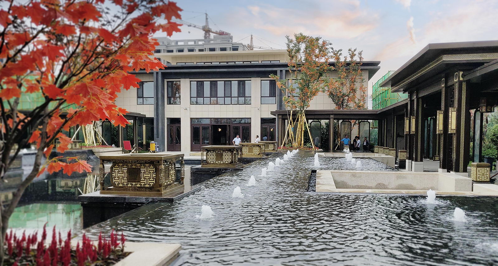 鏡面水景輕靈、優(yōu)雅、致韻;雙排四座宮燈雕琢萬字符,寓意前程萬福。
